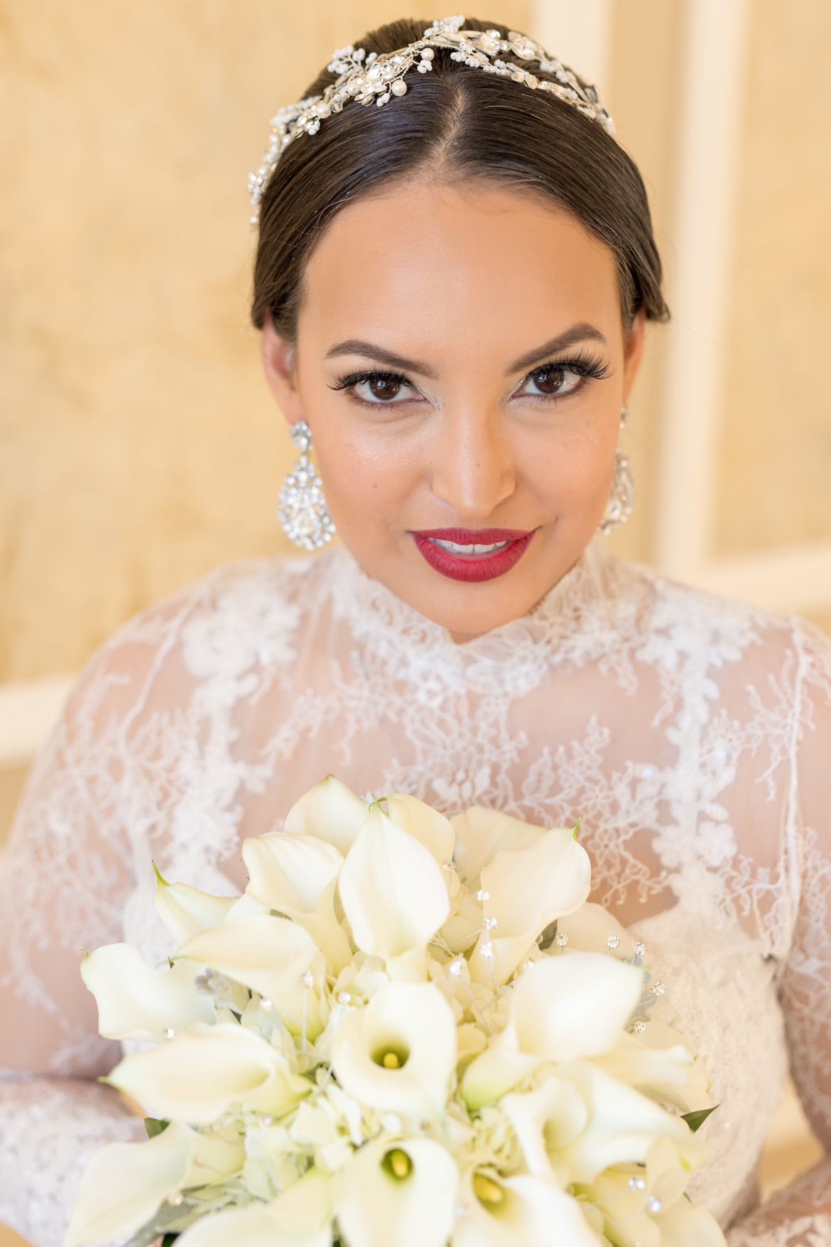 Embracing a romantic and sophisticated style, our beloved #jewelsbride adorned herself with grace. The Wynter hair vine, embellished with crystals and pearls, elegantly complemented her high-neck lace wedding gown, cascading with beauty. Completing her ensemble, the Dance with Me earrings added a vintage charm, lending a refined touch to her overall look.