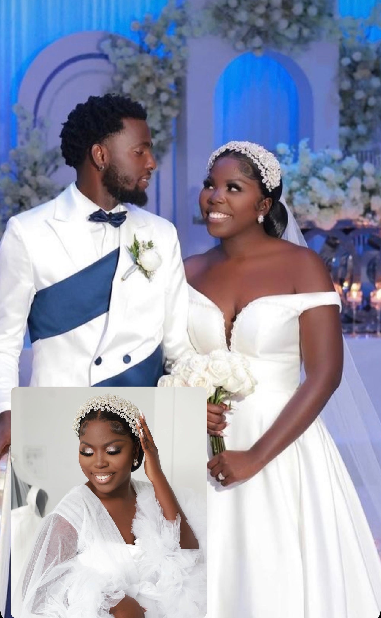 "We seamlessly paired the extravagant crystal-covered Isabelle headpiece with our Tessa earrings, crafting the ultimate glamorous look for our faux bride. This perfect duo enhances her elegance while beautifully complementing her stunning blonde hair, speaking volumes without overwhelming her desired aesthetic."