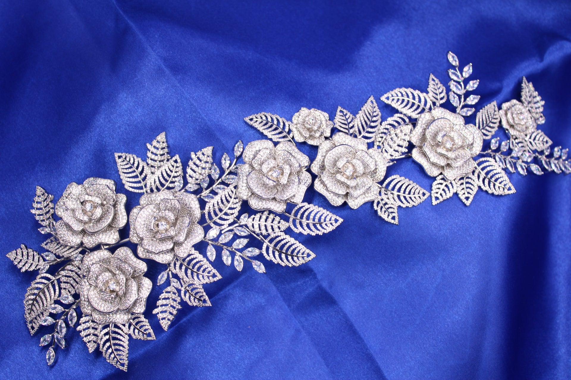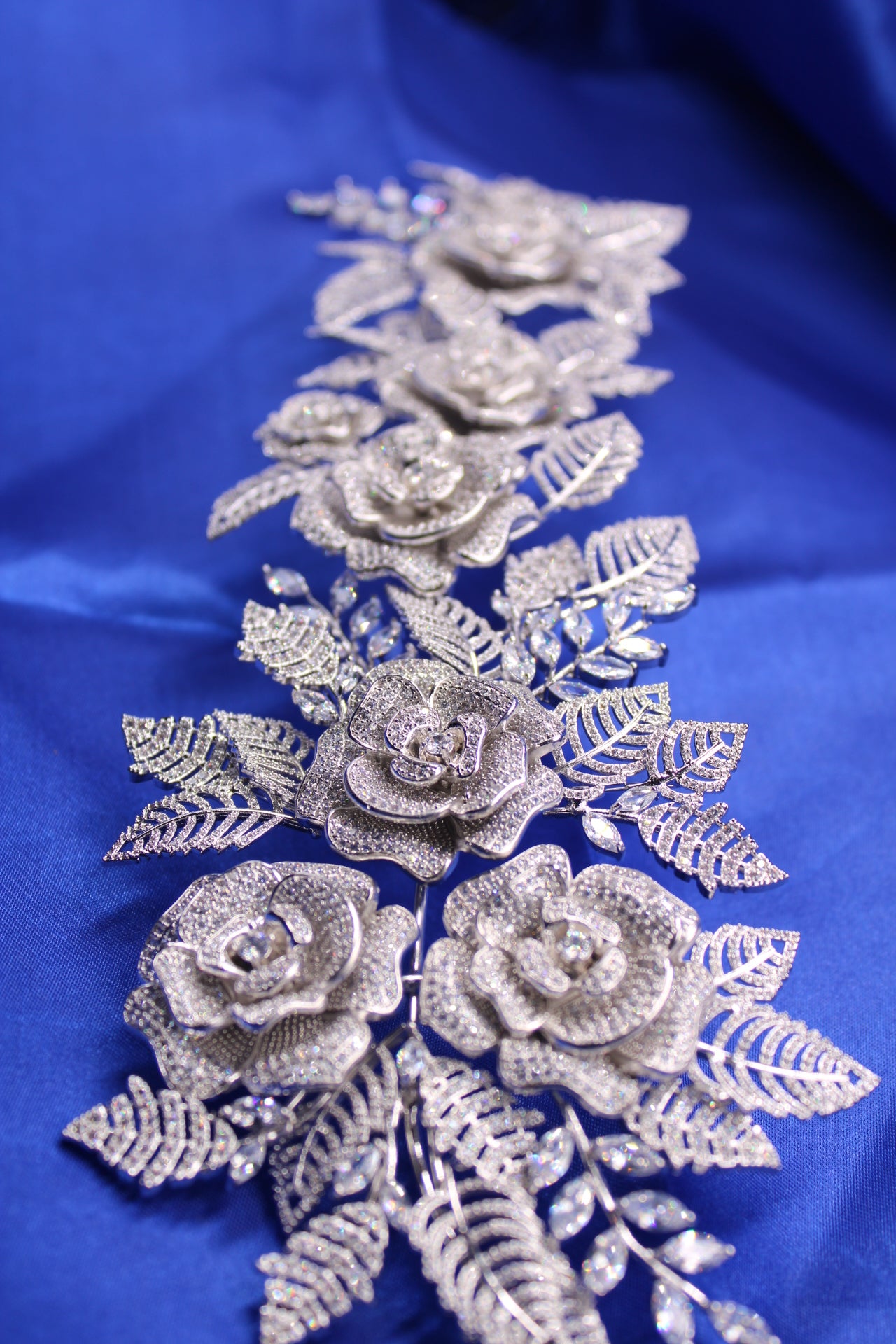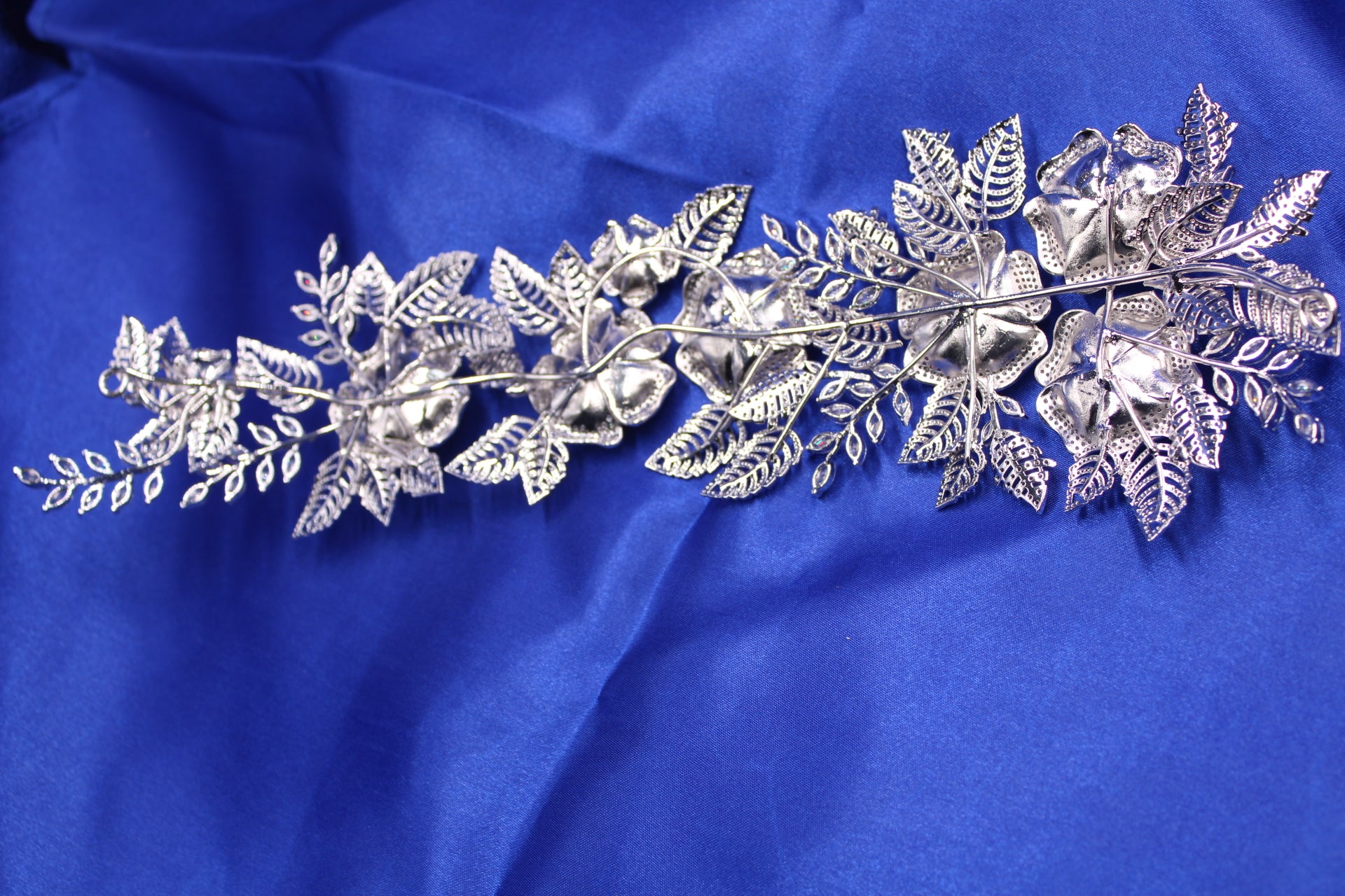 The Avery headpiece is very flexible and standouts with its oval shaped crystals and non-stop shine. The beautiful Floral headpiece has a large floral accent at the beginning and cascade into a smaller floral at its tip for a more dramatic look.
