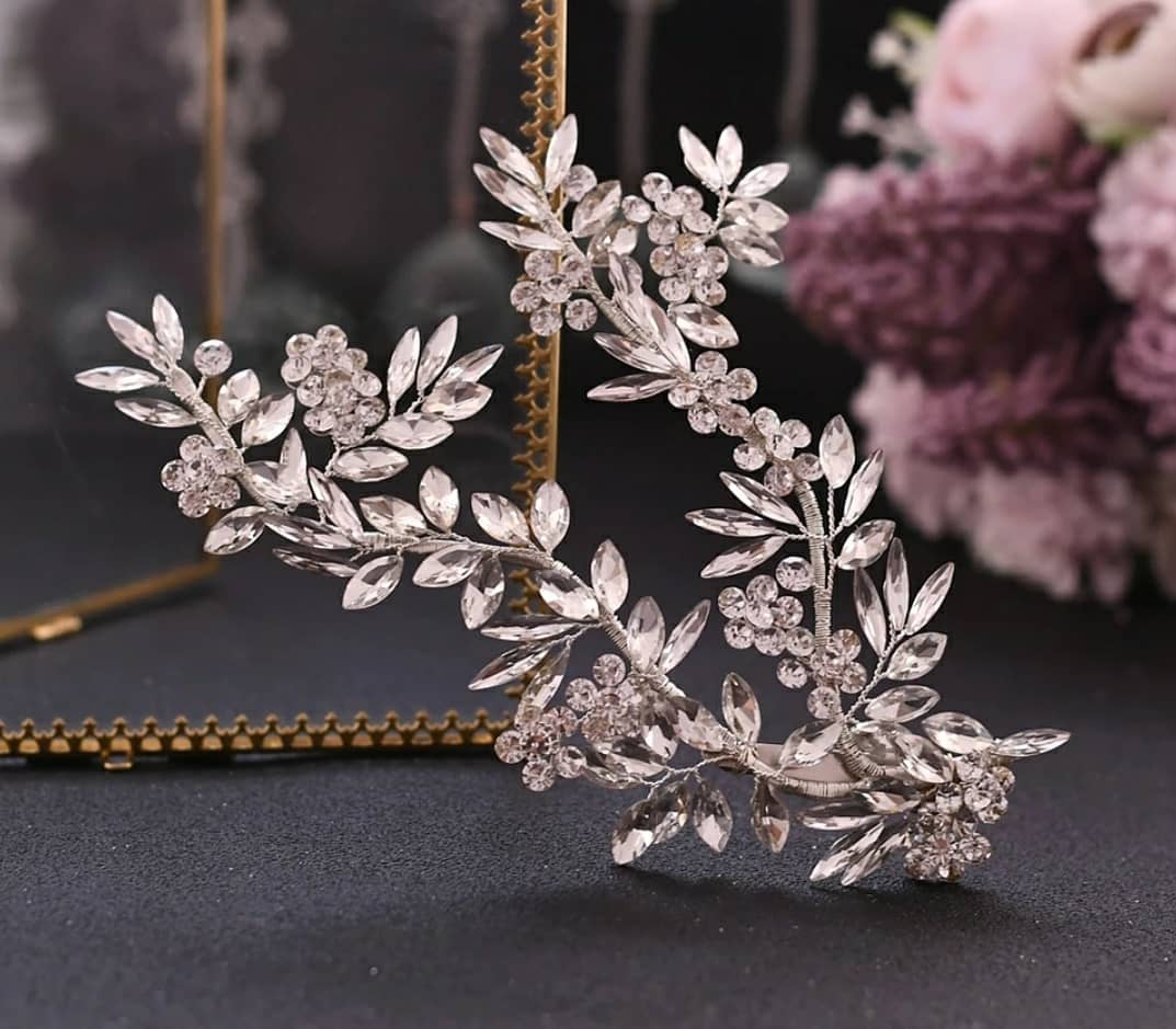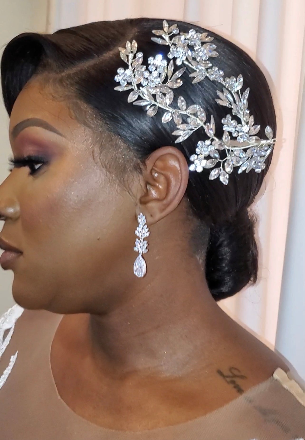 Our Chanel hairclip is extremely lightweight and flexible which is perfect and will add a dramatic yet beautiful glow to your hairstyle. Model is also wearing our silver Layla earrings.