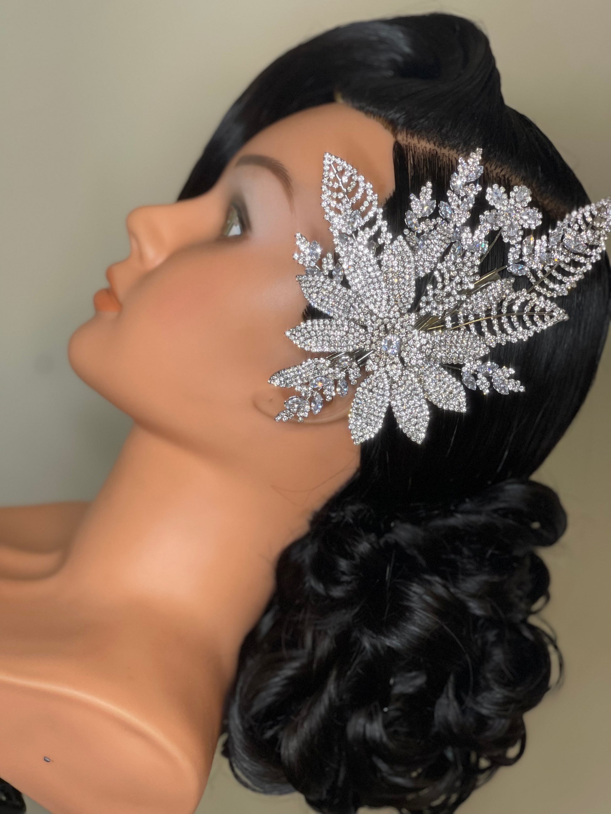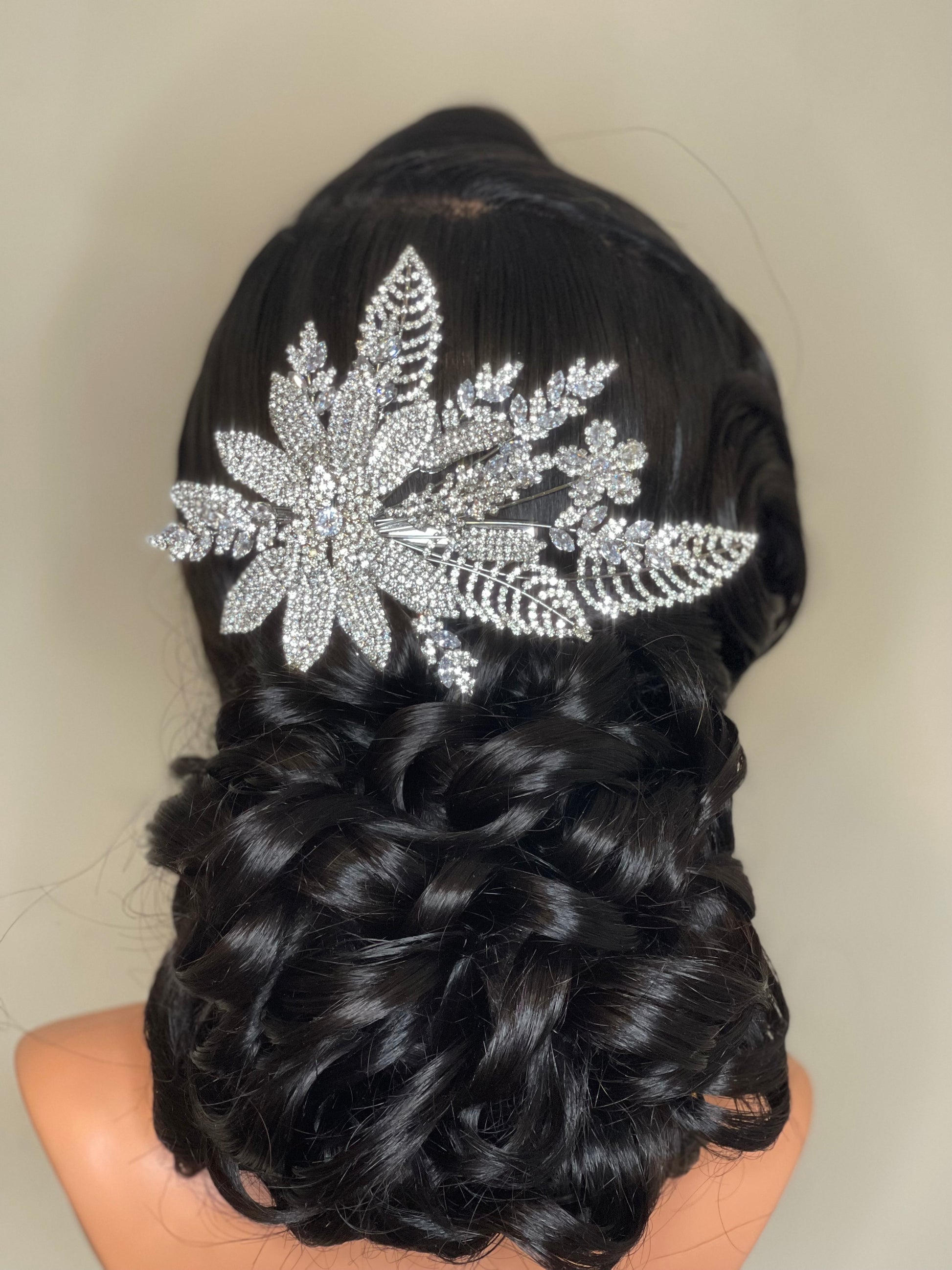 Our gorgeous Colette hair clip has the perfect blend of florals and stems covered in crystal clear stones and cluster of stones that shines and reflect the beauty of the comb.