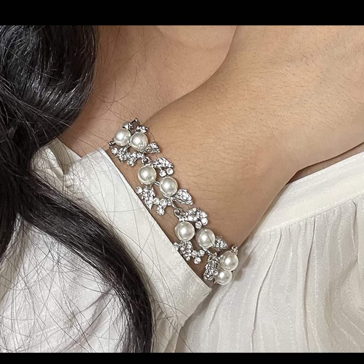 This is a sophisticated bracelet perfect for bridal or formal wear. It features an intricate design of alternating pearls and sparkling crystals, arranged in a floral-inspired pattern. The bracelet's delicate silver-tone frame enhances its elegance, making it an ideal accessory for weddings, receptions, or special occasions. Its timeless style pairs beautifully with a variety of bridal gowns and evening attire.