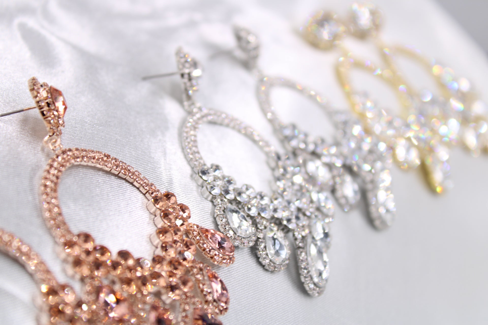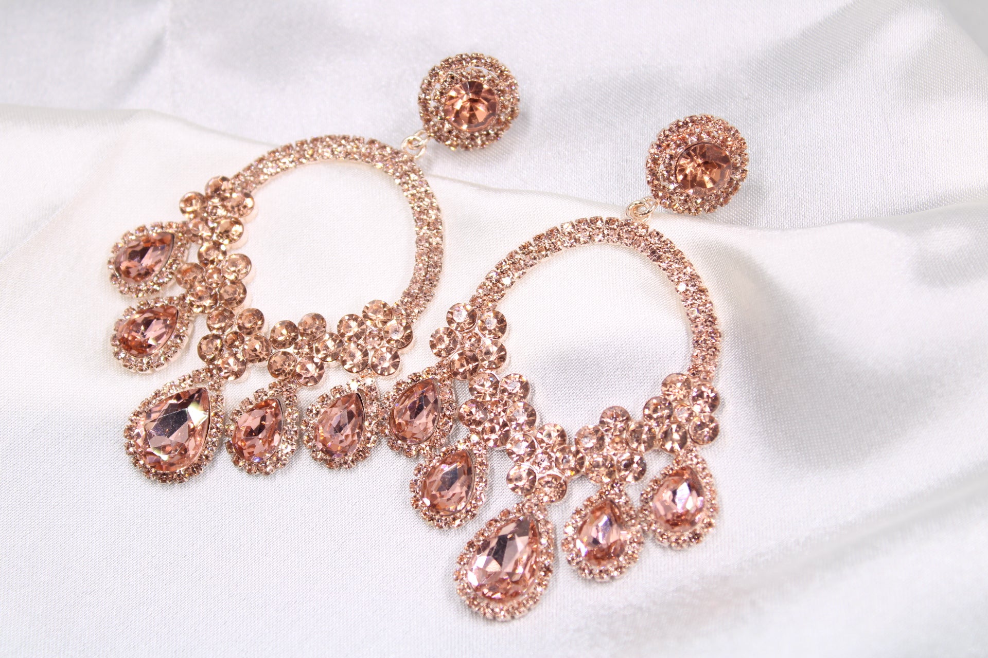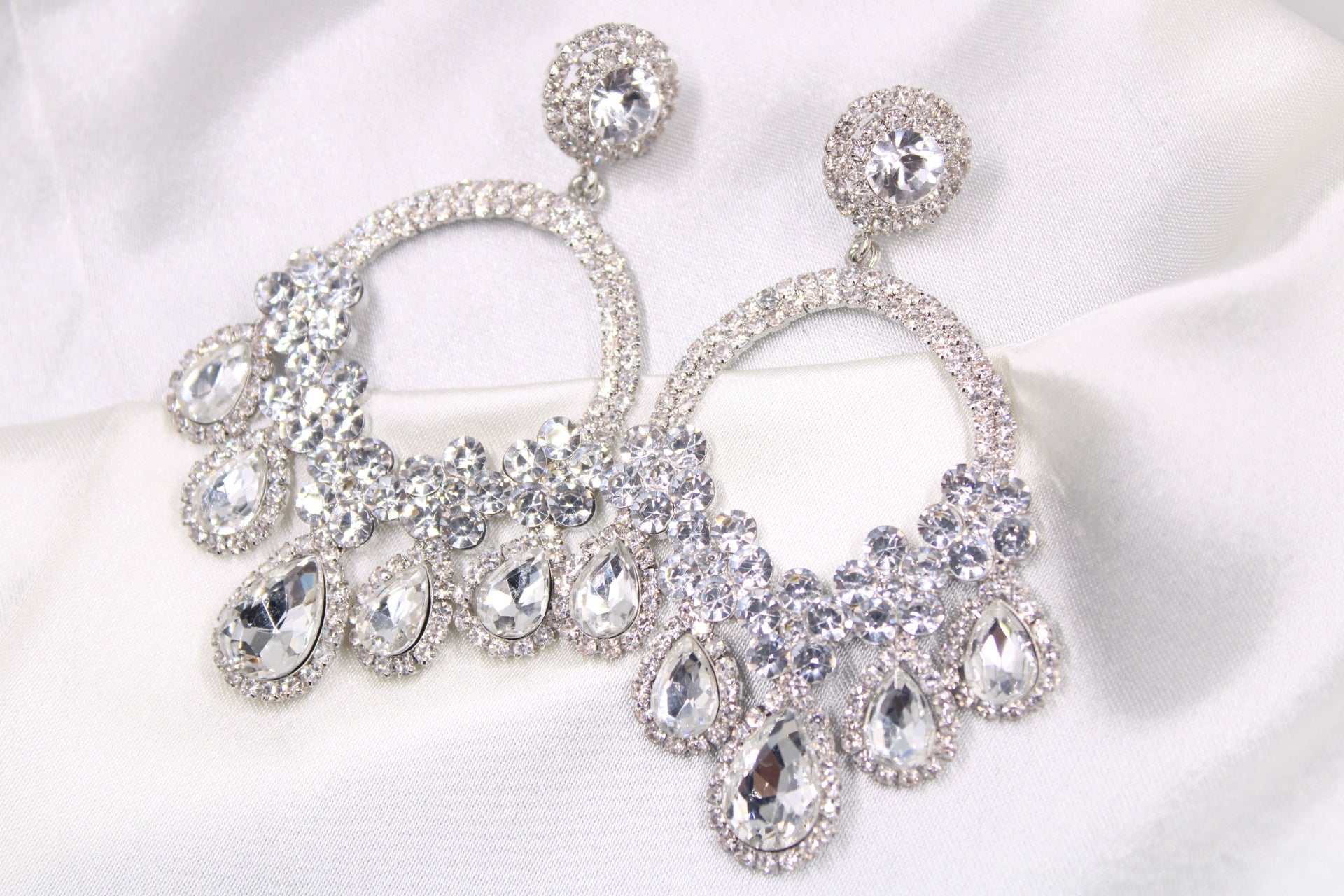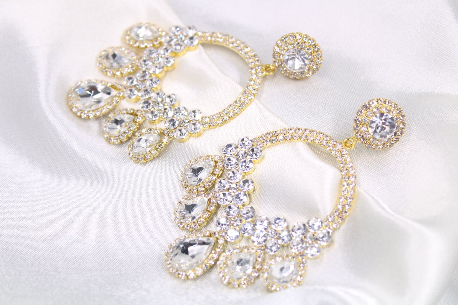 Our hoops earring is covered in crystals with additional stones hanging at the bottom for an extra dramatic effect.