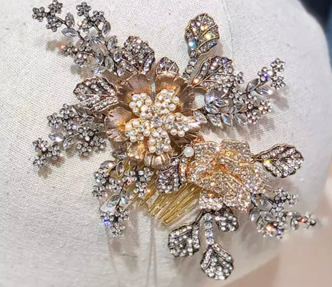 Description: The Grace hair comb is made up of pearls and has golden leaf details throughout as well as two floral stems in front.