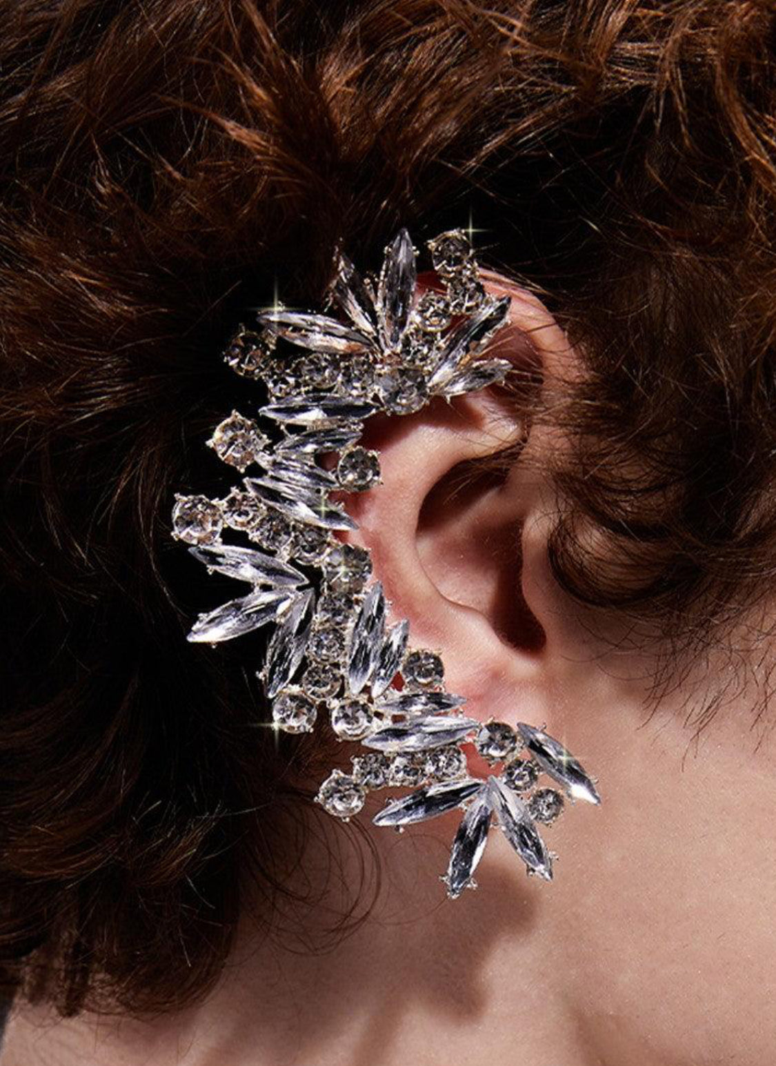 This exquisite crystal ear cuff is a statement piece designed for those who embrace bold, glamorous fashion. Featuring an intricate arrangement of marquise-cut and round-cut crystals, it cascades elegantly along the curve of the ear, creating a dazzling, sculptural effect.