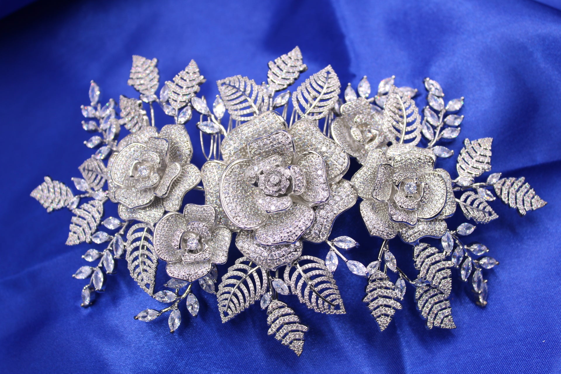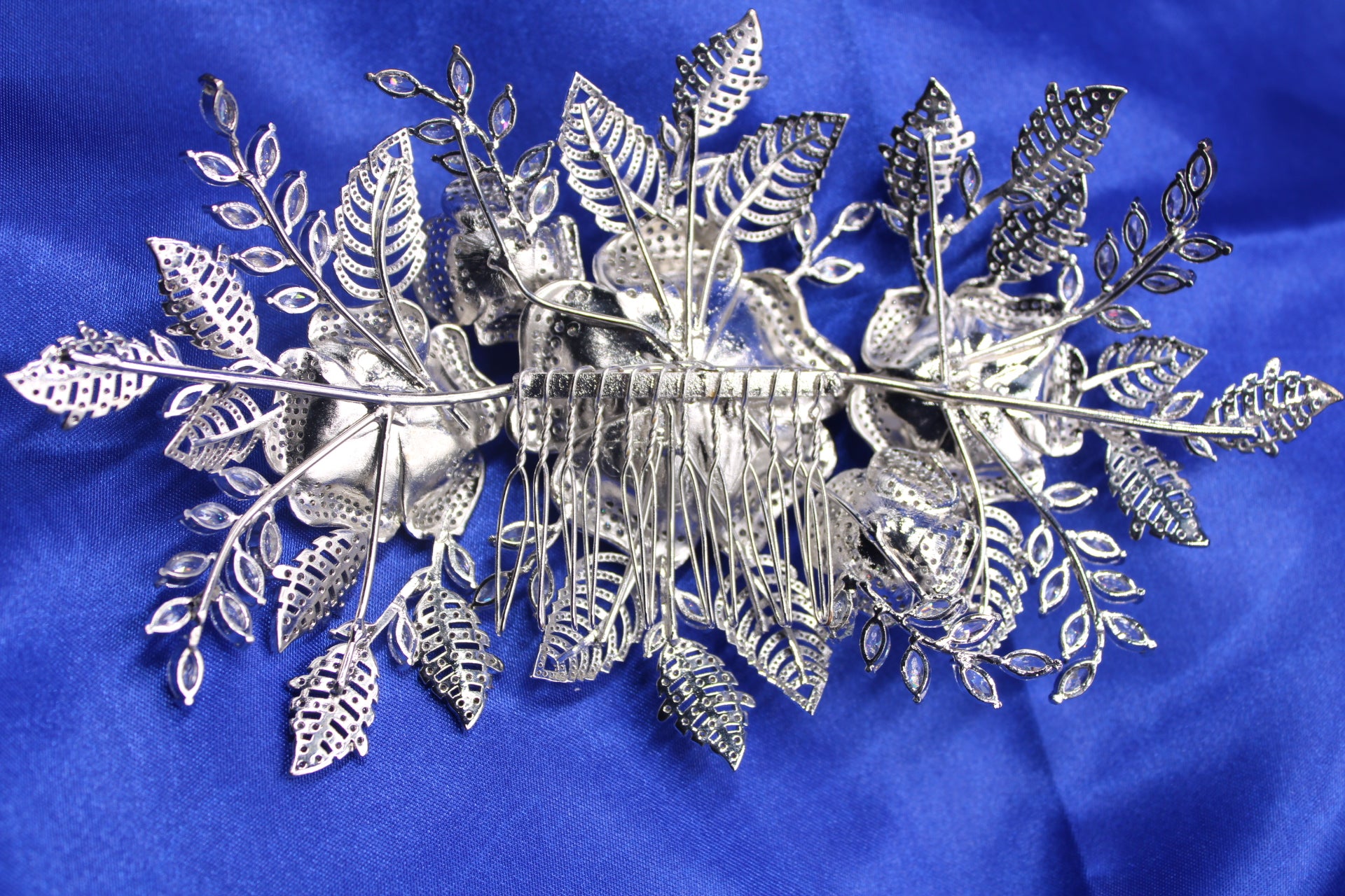 Description: Our breathtaking Zaraya floral haircomb is made of cluster of crystal throughout and definitely standout. Model can also be seen wearing our Winter earrings to complete the look.